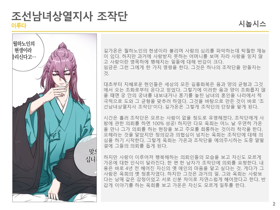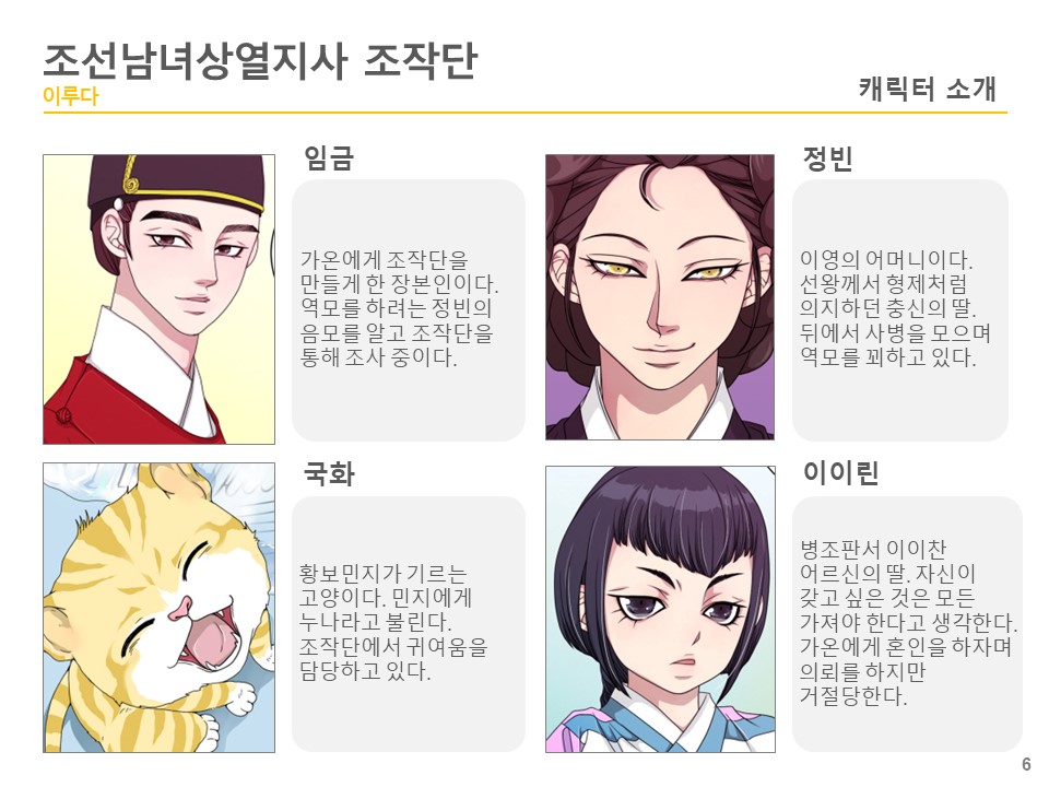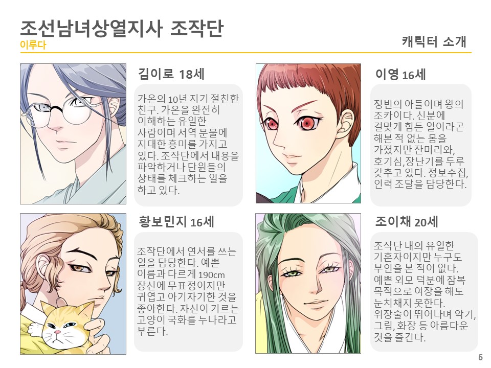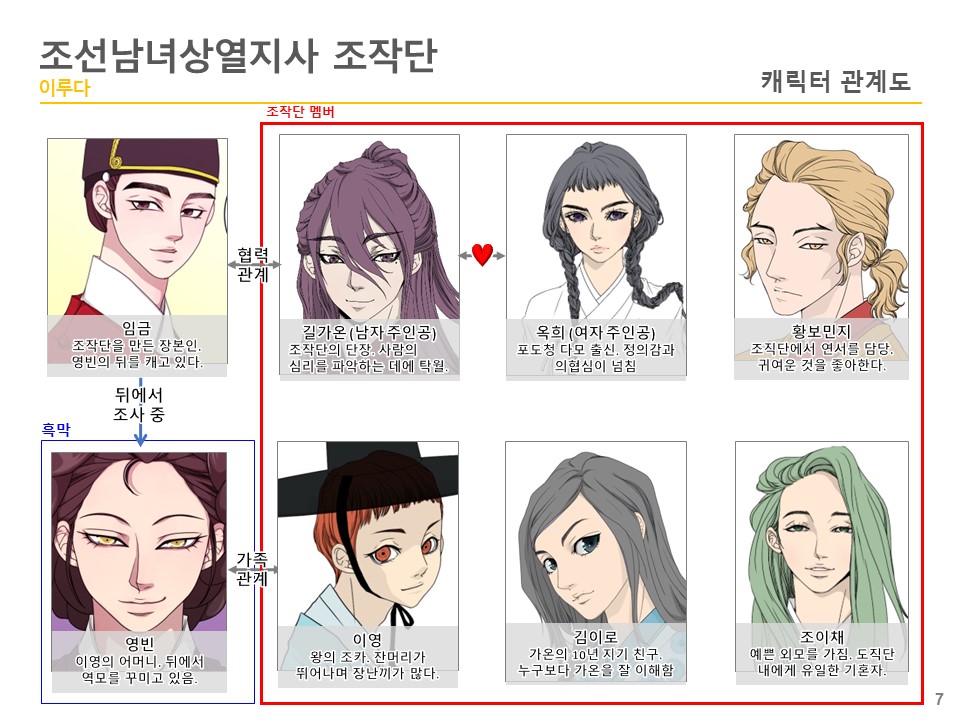 사람의 마음을 읽는 조작단의 단장 길가온을 필두로 그의 소꿉친구이자 유일한 이해자인 김이로, 왕의 조카인 이영, 남다른 감수성을 가진 황보민지, 비밀을 감춘 미남자 이채 5인이 의뢰인의 사랑을 이루어 주기 위해 노력한다.
