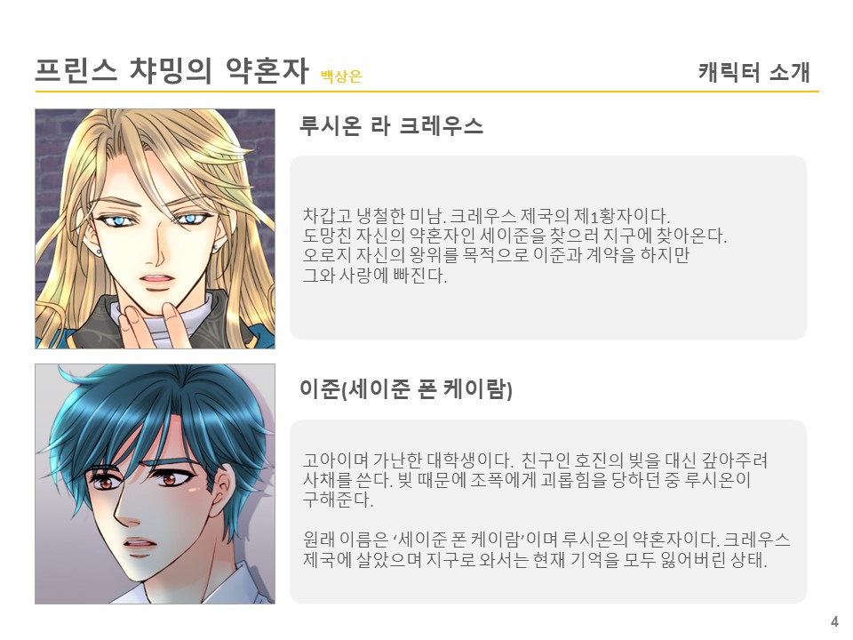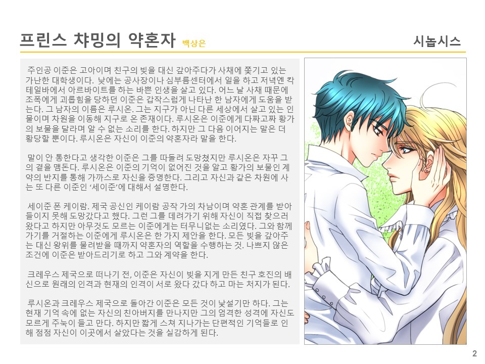 그래서일까, 어느 날 그를 찾아온 낯선 이를 그의 집에 두게 된 이유가…. 비록 그가 백마 탄 왕자님 같은 외모로 다른 세상에서 날아온 자신의 약혼자라 주장하는 정신이상자라도 말이다!