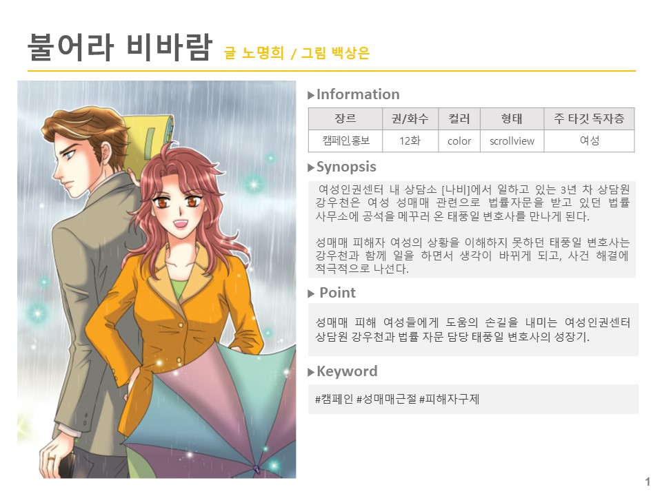 여성인권센터 내 상담소 [나비]에서 일하고 있는 3년 차 상담원 강우천은 여성 성매매 관련으로 법률자문을 받고 있던 법률 사무소에 공석을 메꾸러 온 태풍일 변호사를 만나게 된다.