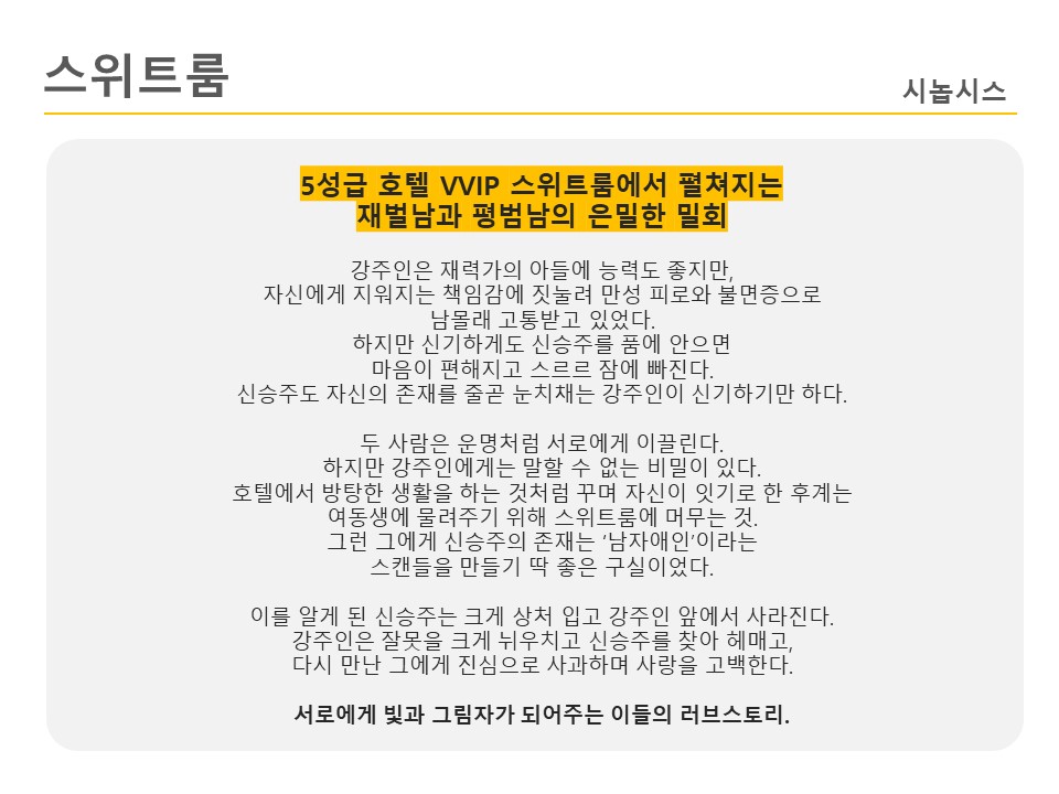 호텔에서 알바 중인 신승주는 존재감이 없어 사람들에게 무시 아닌 무시를 당하는 것이 큰 고민이다. 그러던 어느 날, 자신을 먼저 알아봐 준 사람 강주인을 만나면서 서로가 서로에게 이끌리게 된다.