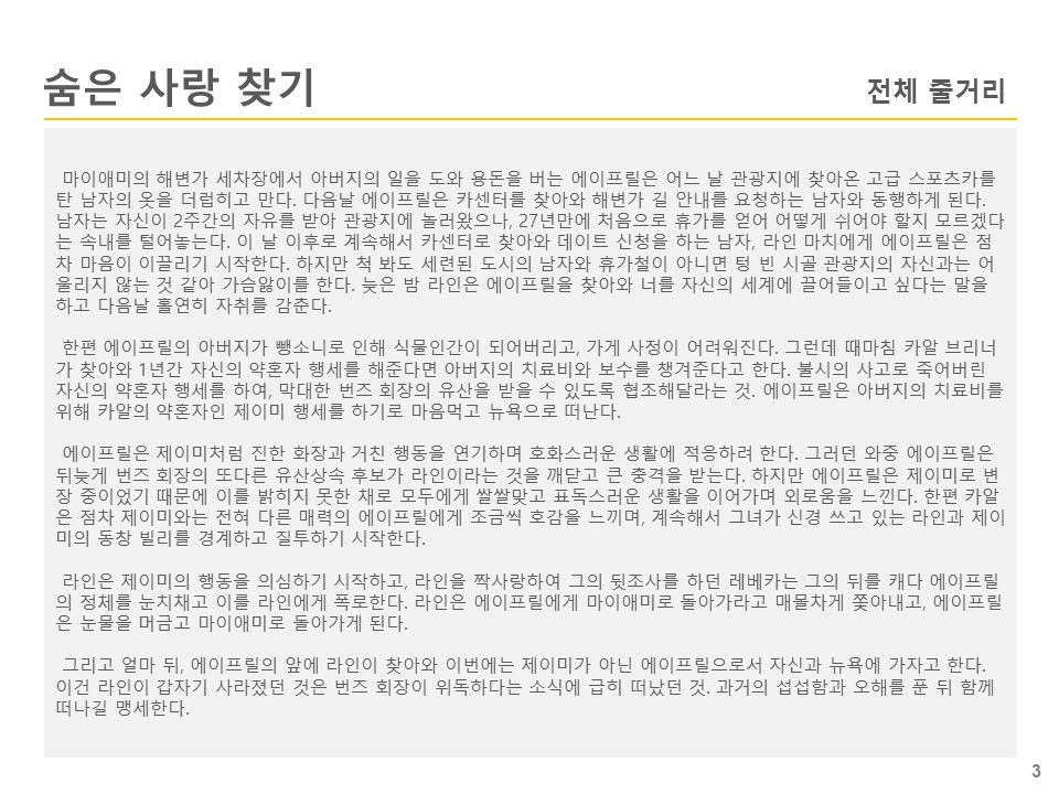 푸른 바다와 금빛 모래사장의 마이애미. 방학 동안 아버지의 주유소 일을 돕던 천방지축 에이프릴은 실수로 한 남자의 옷을 더럽히고 만다. 그런데 이를 계기로 어쩐지 그 남자가 에이프릴에게 지대한 관심을 보이기 시작한다. 세련된 뉴욕의 신사와 마이애미의 어린 여자아이는 진정한 친구가 될 수 있을까?