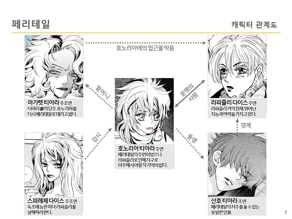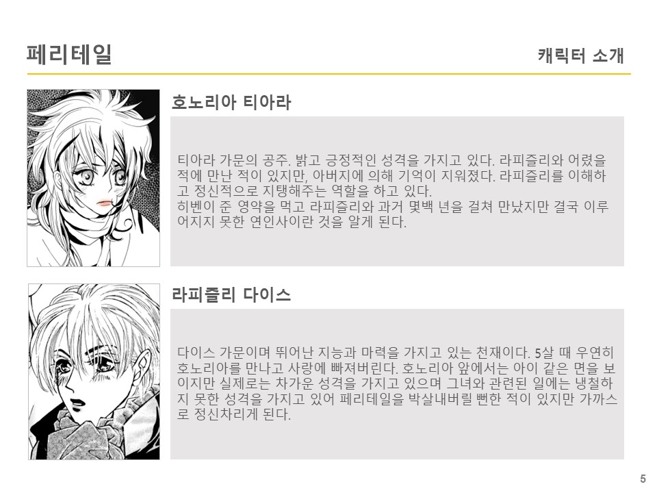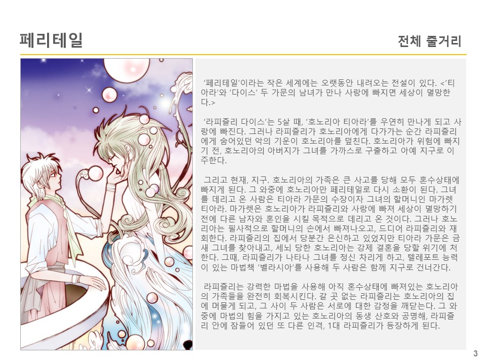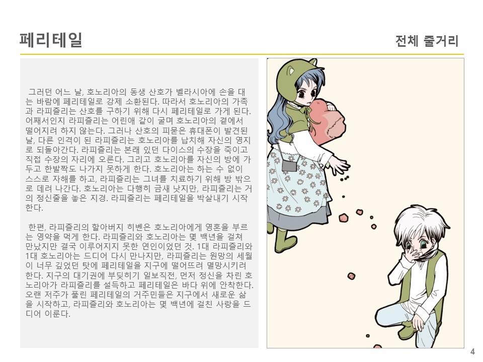 이루어지지 못한 사랑 때문에 저주를 받아 고립된 작은 세계인 페리테일에는 <‘티아라’와 ‘다이스’ 두 가문의 남녀가 만나 사랑에 빠지면 세상이 멸망한다.>라는 오랜 전설이 있다.