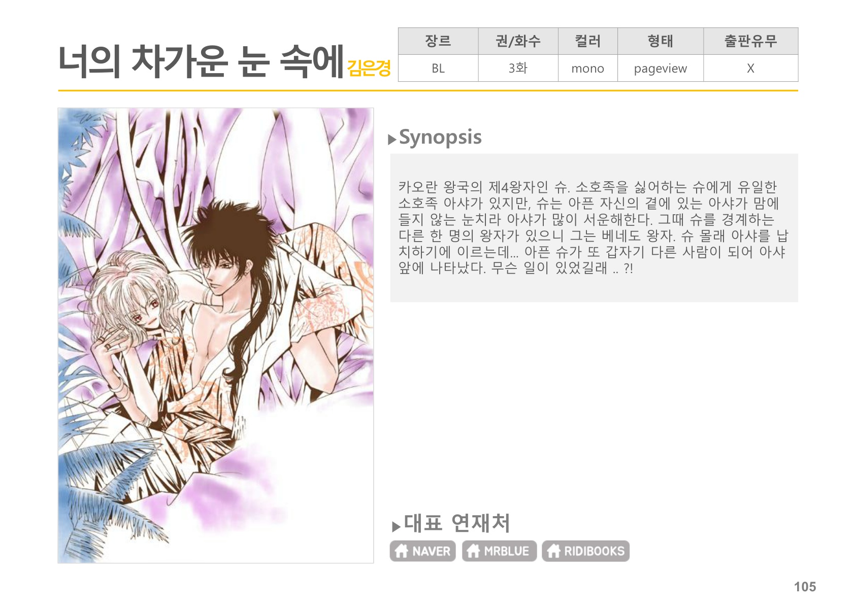 카오란 왕국의 제4왕자인 슈. 소호족을 싫어하는 슈에게 유일한 소호족 아샤가 있지만, 슈는 아픈 자신의 곁에 있는 아샤가 맘에 들지 않는 눈치라 아샤가 많이 서운해한다. 그때 슈를 경계하는 다른 한 명의 왕자가 있으니 바로 베네도 왕자. 그는 슈 몰래 아샤를 납치하기에 이르는데….