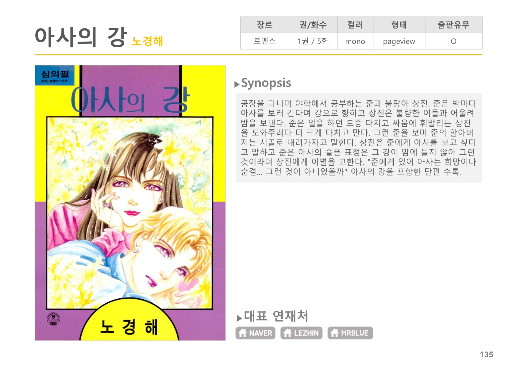 공장을 다니며 야학에서 공부하는 준과 불량아 상진. 준은 밤마다 아사를 보러 간다며 강으로 향하고 상진은 불량한 이들과 어울려 밤을 보낸다. 그러던 어느 날 준은 일을 하다 다친 와중에 싸움에 휘말린 상진을 도와주려다 더 크게 다치고 만다. 그런 준을 보며 준의 할아버지는 시골로 내려가자고 말한다. 떠나기 전 상진은 준에게 아사를 보고 싶다고 말하고 준은 아사의 슬픈 표정은 그 강이 맘에 들지 않아 그런 것이라며 상진에게 이별을 고한다. "준에게 있어 아사는 희망이나 순결…, 그런 것이 아니었을까" <아사의 강>을 포함한 단편 수록.