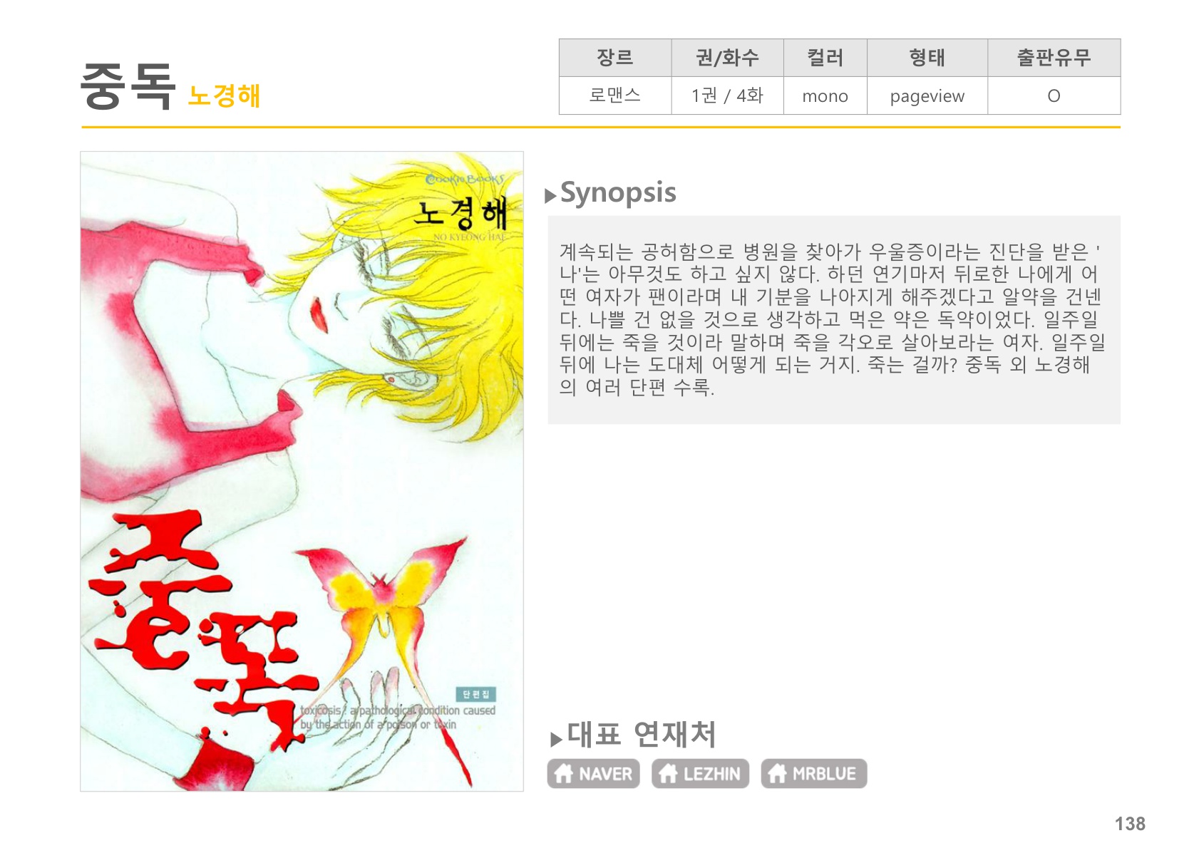 계속되는 공허함으로 병원을 찾아가 우울증이라는 진단을 받은 '나'는 아무것도 하고 싶지 않다. 연기마저 뒤로 한 나에게 어떤 여자가 팬이라며 내 기분을 나아지게 해주겠다고 알약을 건넨다. 나쁠 건 없을 것으로 생각하고 먹은 약은 독약이었다. 일주일 뒤에는 죽을 것이라 말하며 죽을 각오로 살아보라는 여자. 일주일 뒤에 나는 도대체 어떻게 되는 거지. 죽는 걸까? <중독> 외 노경해의 여러 단편 수록.