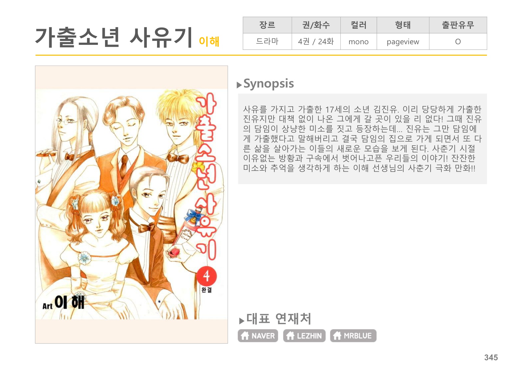 가정불화에 따른 부적응 및 스트레스라는 정당한 가출 사유를 가지고 가출한 17세의 소년 김진유. 이리 당당하게 가출한 진유지만 대책 없이 나온 그에게 갈 곳이 있을 리 없다! 그때 진유의 담임이 상냥한 미소를 짓고 등장하는데…. 진유는 그만 담임에게 가출했다고 말해버리고, 결국 담임의 집으로 가게 되면서 또 다른 삶을 살아가는 이들의 새로운 모습을 보게 된다. 사춘기 시절 이유 없는 방황과 구속에서 벗어나고픈 우리들의 이야기! 잔잔한 미소와 추억을 떠올리게 하는 이해 선생님의 사춘기 극화 만화!!