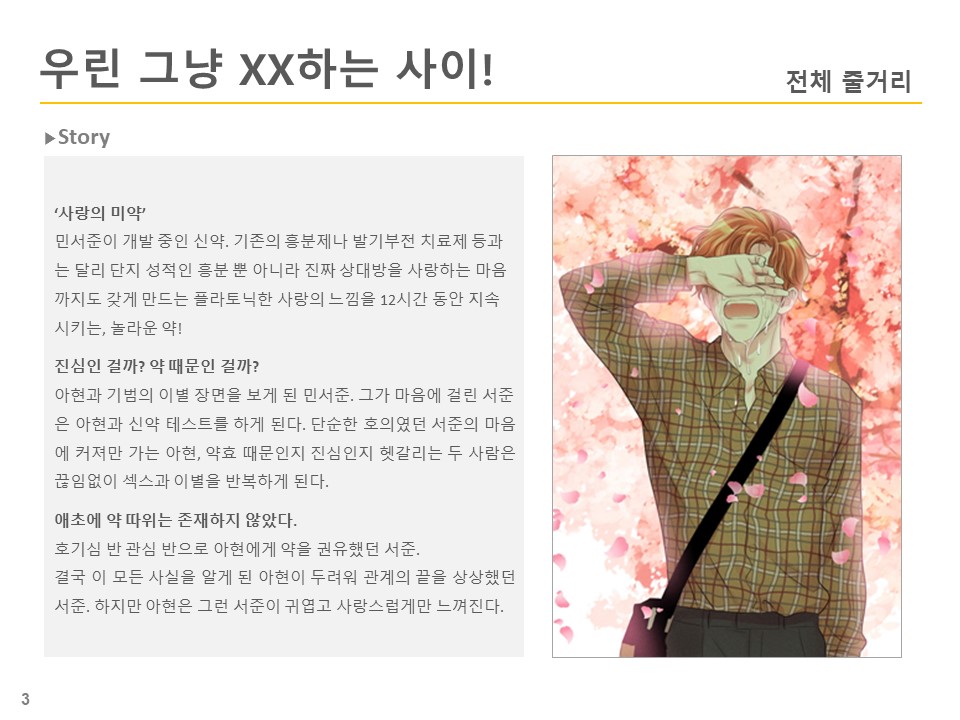 아프기만한 성관계로 결국 기범에게 이별을 통보받고 슬픔에 빠진 찰나, 그 모습을 목격한 신약개발원 '민서준'에게 '사랑의 미약'으로 테스트 제안을 받게 되는데…