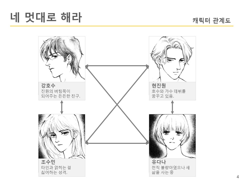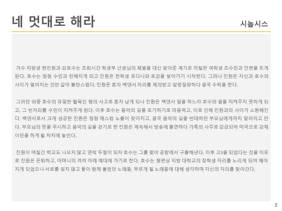 고등학생 신분으로 가수로 활약하고 있는 현진원과 가수 지망생 강호수는 조회시간 학생부 선생님의 체벌을 대신 맞아준 계기로 조수민과 안면을 트게 된다. 자신의 환경과 불확실한 미래에 방황하면서도 성장하는 등장인물들의 청춘 스토리.