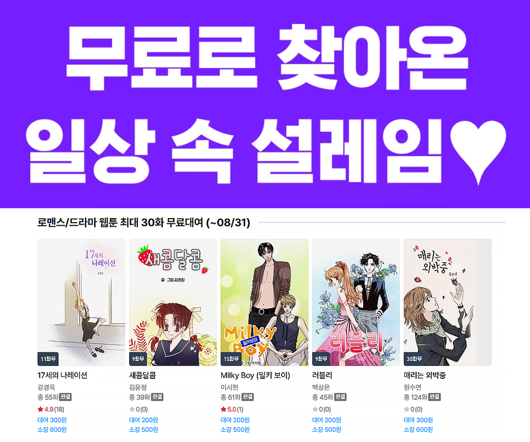 지금 바로 리디북스 ‘로맨스/드라마 웹툰’ 이벤트 페이지에서 <17세의 나레이션>외 4작품을 만나보세요!