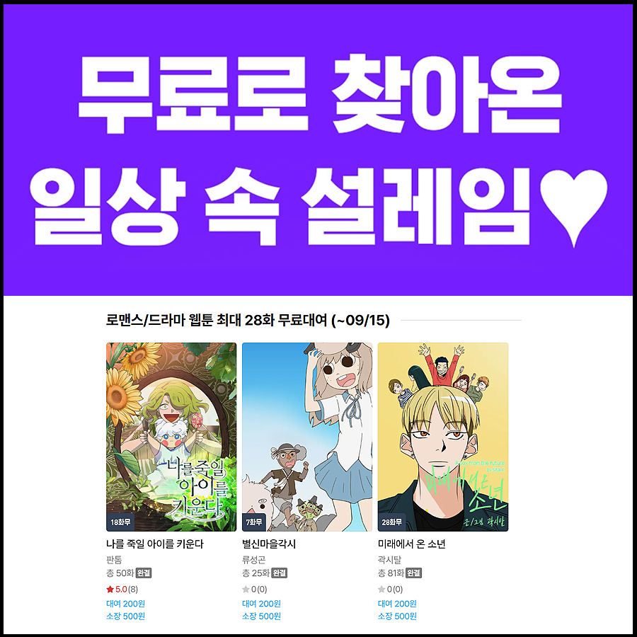 지금 바로 리디북스 ‘로맨스/드라마 웹툰’ 이벤트 페이지에서 <나를 죽일 아이를 키운다>외 2작품을 만나보세요!