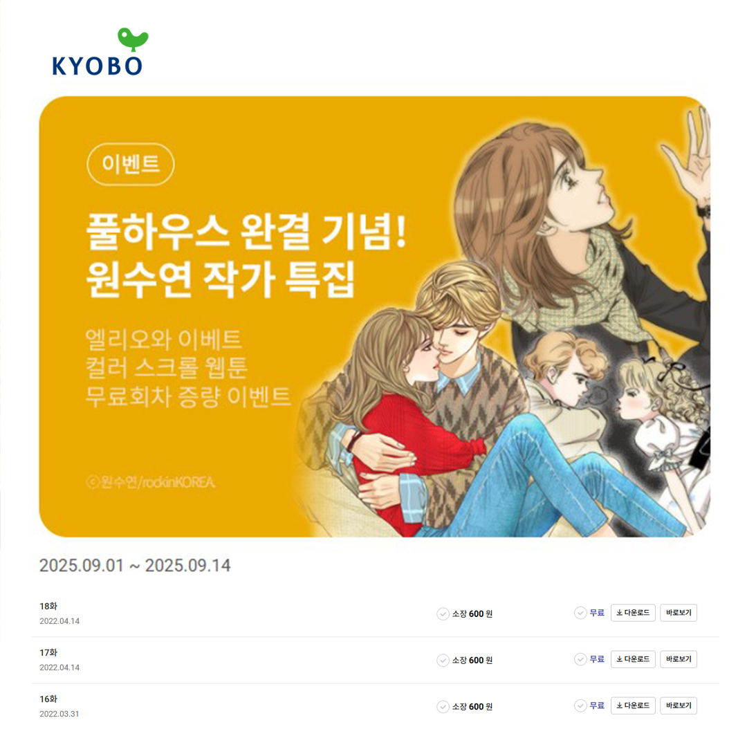 ▶ 이벤트 내용 : 교보ebook 웹툰 단독 프로모션 [풀하우스 완결 기념! 원수연 작가 특집]